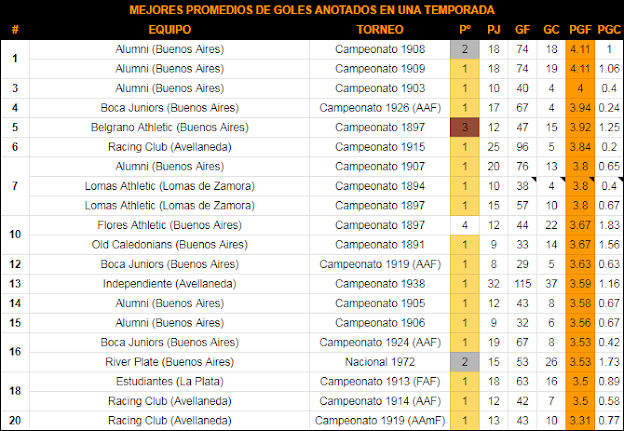 Ahora bien, esto nos lleva a pensar ¿es medible quién metió más o quien metió menos? Considerando que las formas de disputa de los torneos en Argentina ha sido, digamos, volátil (?). Pues claro que se complica, así que para pulirlo un poco al asunto, los acomodaremos según promedio de goles a favor y en contra. Entonces, ¿los mejores promedio de goles anotados? Alumni tanto en 1908 como en 1909 terminó con 4,11 goles por partido, aunque curiosamente solo fue campeón en la segunda ocasión. Y justamente este equipo tiene la tercera campaña en la historia con más de cuatro goles por partido, alcanzada unos años antes, en 1903. Aquí es casi todo potestad de los campeones, salvo cuatro casos de este top 20.